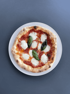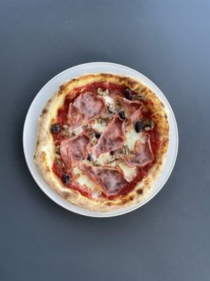 Tomato, mozzarella, smoked ham, mushrooms and olives.
