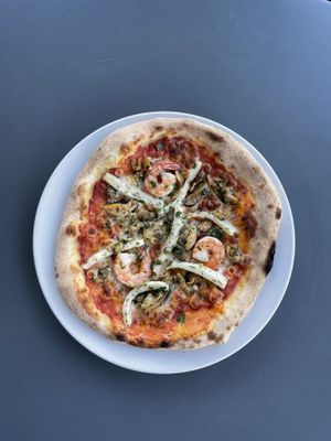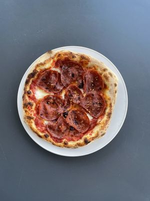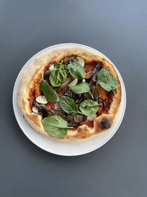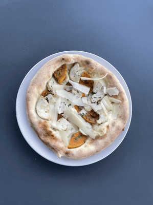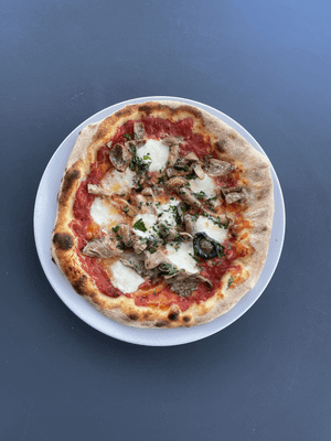 Tomato, mozzarella, porcini mushrooms and a touch of truffle oil.
