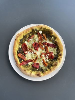 Pesto, sun dried tomatoes, roasted peppers and goats' cheese.