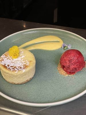Lemon flavored cheesecake, lemon curd and raspberry ice cream.
