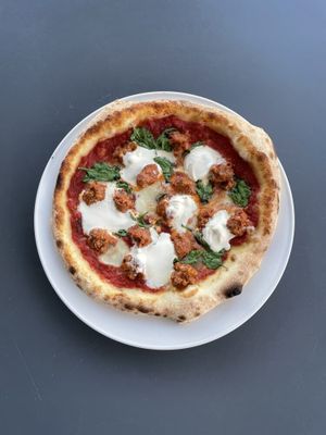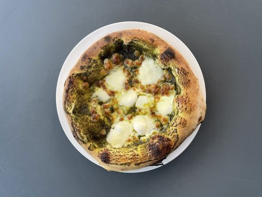 Tomato, spicy pork sausage, spinach, mascarpone cheese and a touch of nutmeg.