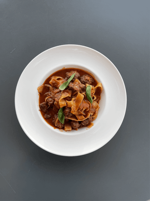 Long flat pasta, braised beef, tomato and meatball ragu.