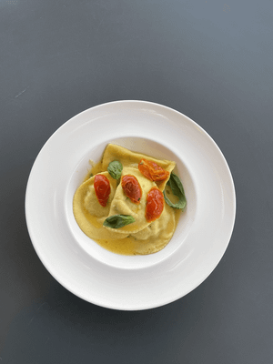 Pasta filled with goat cheese, spinach and roasted tomato.