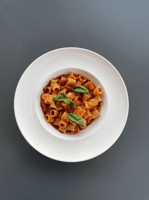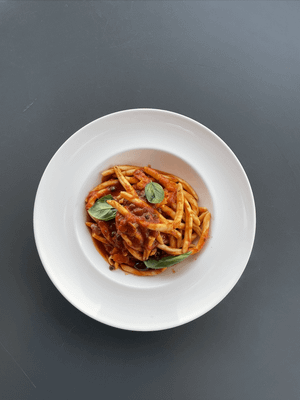 Semolina pasta, tomato, black olives, capers, anchovies and garlic.