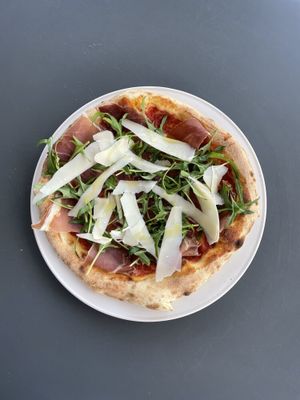 Tomato, rocket, prosciutto and shaved parmesan cheese.
