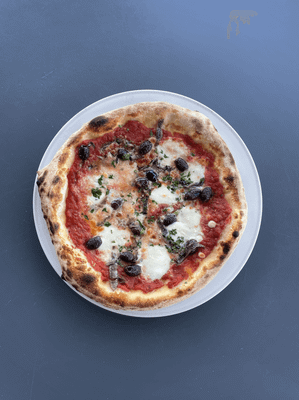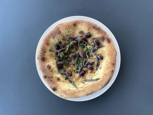 Focaccia topped with black olives, anchovies, oregano and olive oil. Served with baked on premises.