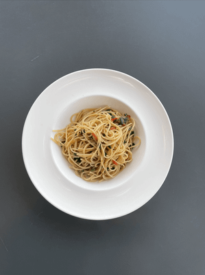 Spaghetti, garlic, anchovies, chilli and extra virgin olive oil.