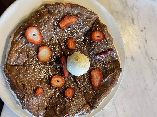 Pizza base topped with Nutella, strawberries and vanilla ice cream to share.