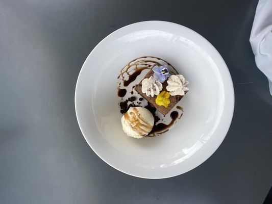 Hazelnut cake drizzled with spiked coffee syrup and vanilla ice cream gluten free.