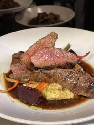 Saltbush lamb backstrap, chargrilled, chickpea puree, rosemary jus, roasted carrot and beetroot.