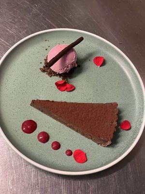 The chocolate tart shell, creamy chocolate filling and raspberry ice cream.