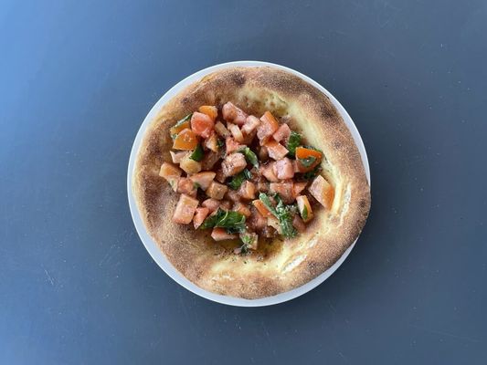 Focaccia topped with tomato, extra virgin olive oil, basil and garlic. Served with baked on premises.