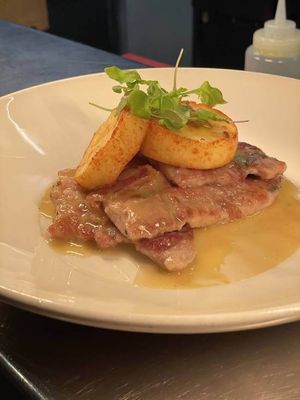 Veal scallopini, prosciutto, sage, white wine and gnocchi romana made with semolina flour.