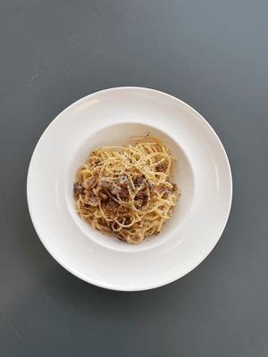 Spaghetti , Guanciale,Eggs ,Black pepper , Parmesan and Pecorino cheese