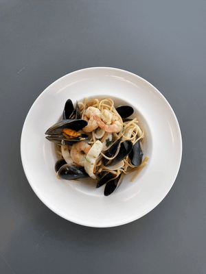 Long thin flat pasta, mixed seafood, white wine and garlic.