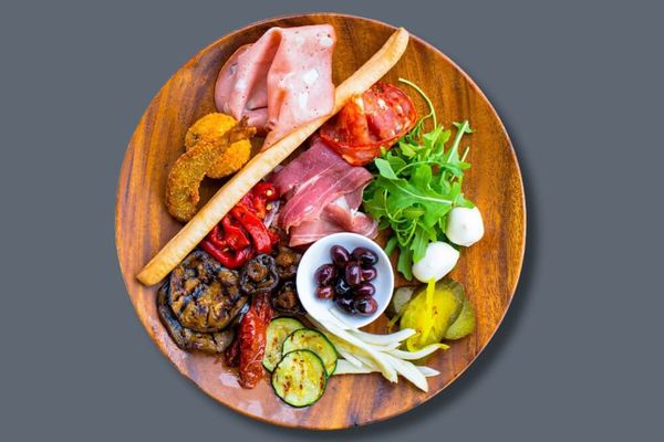 Tomato, mozzarella, roasted capsicum, eggplant, zucchini, pumpkin, olives and spinach leaves.